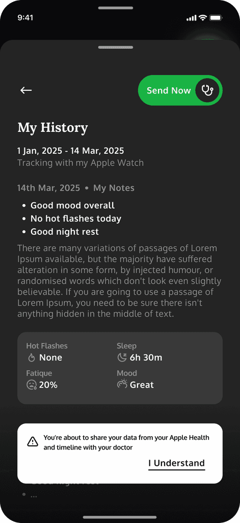 Easily log your symptoms, cycle, mood, sleep, activity and stress—all in one place. Scyla collects and organises your data so you don't have to. You can go back at any time to see what's been tracked and how it correlates. Your data is safely stored in a private enclave, you have full control.